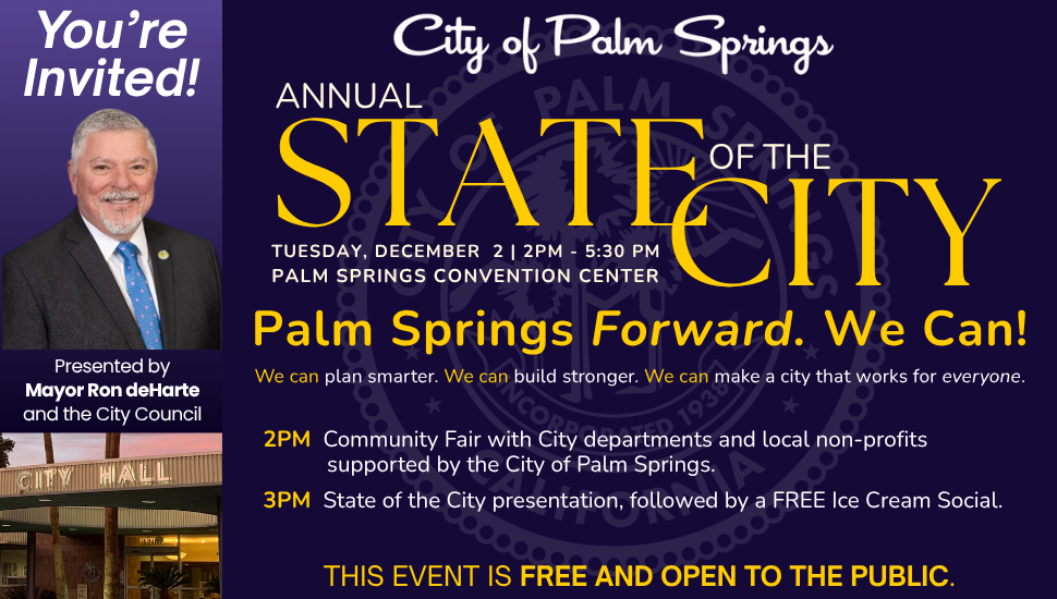 Join Mayor Ron deHarte and the City Council for the State of the City on Tuesday, Dec. 2, 2–5:30 PM at the Palm Springs Convention Center. Celebrate our city’s progress and future as we continue moving Palm Springs Forward—with creativity, resilience, and shared purpose.