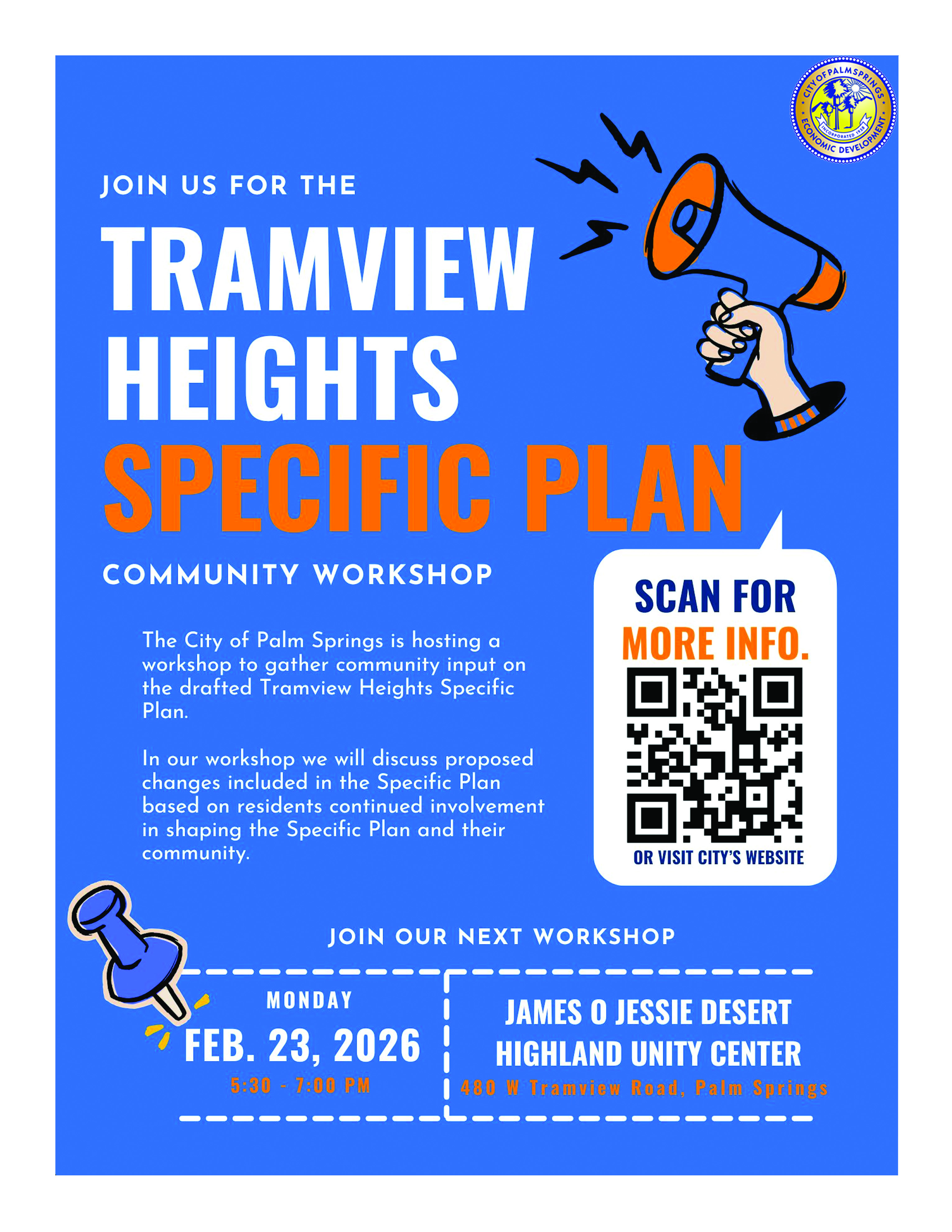 Your voice matters! The City of Palm Springs is hosting a community workshop to gather input on the drafted Tramview Heights Specific Plan (formerly the College Park Specific Plan).