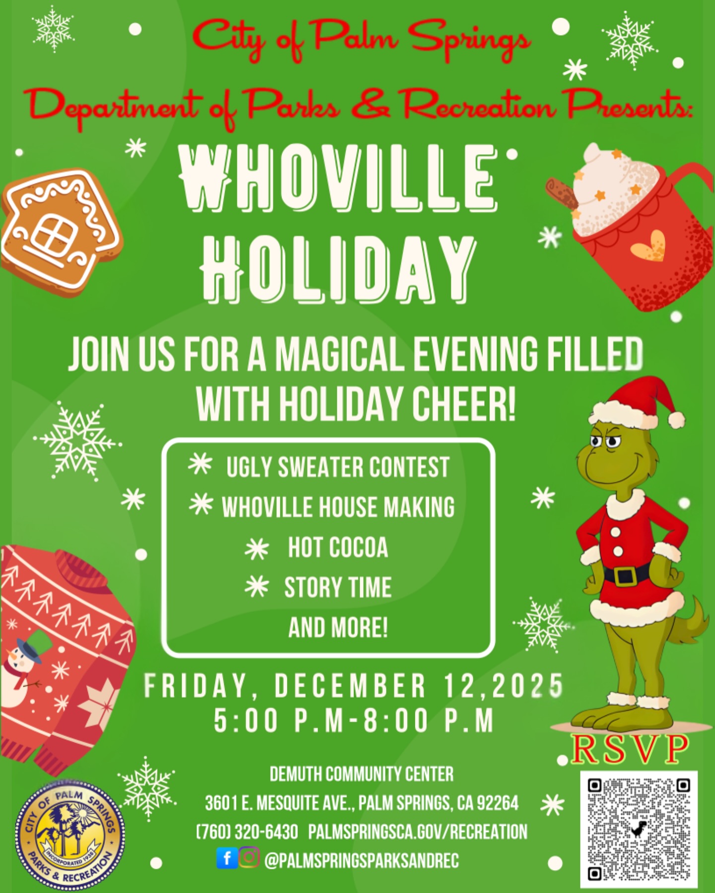 Then, join the Palm Springs City Councilmembers and Santa Claus to light up the City’s stunning 22-foot Holiday Tree at 5:15 p.m. in Frances Stevens Park. The evening includes a meet-and-greet with Santa, free cookies and cocoa, as well as arts and crafts for the little ones.