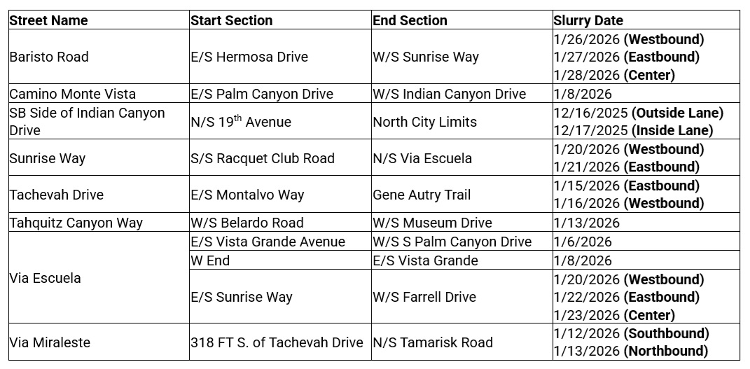 The City will begin its annual slurry seal project on Tuesday, December 16, 2025, with work expected to be completed by the end of January 2026. The project will impact multiple streets throughout the city over the next several weeks.