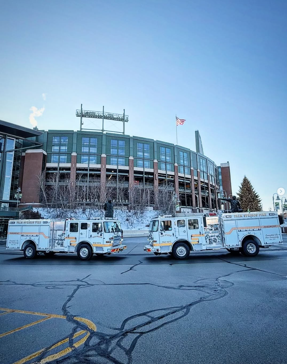 Our team has returned from a short trip to Wisconsin, where the final inspections of two new fire engines were completed. This photo was taken outside Lambeau Field, home of the Green Bay Packers. The engines are expected to arrive in early 2026.