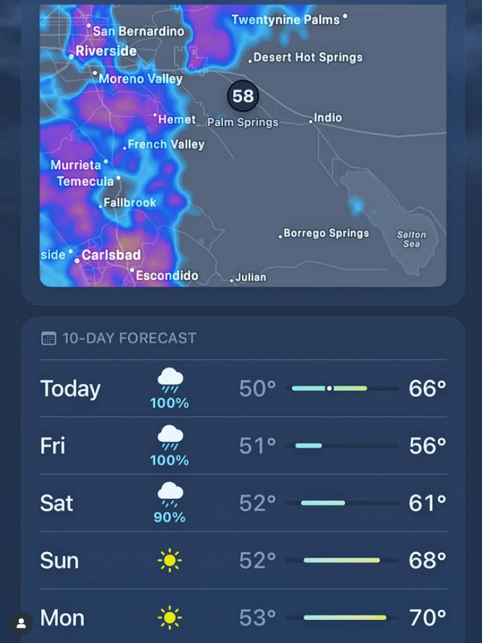 Rain is on the way. Today through Saturday. Palm Springs storms can pack a punch. Roads may still be a bit slick from built-up oils, so take it easy out there. Gusty winds could kick up some dust and debris, so stay aware and enjoy the dramatic skies. Remember to steer clear of flooded dips and washes; flash floods can pop up fast, even in shallow water. Flip on those headlights and keep your eyes open.