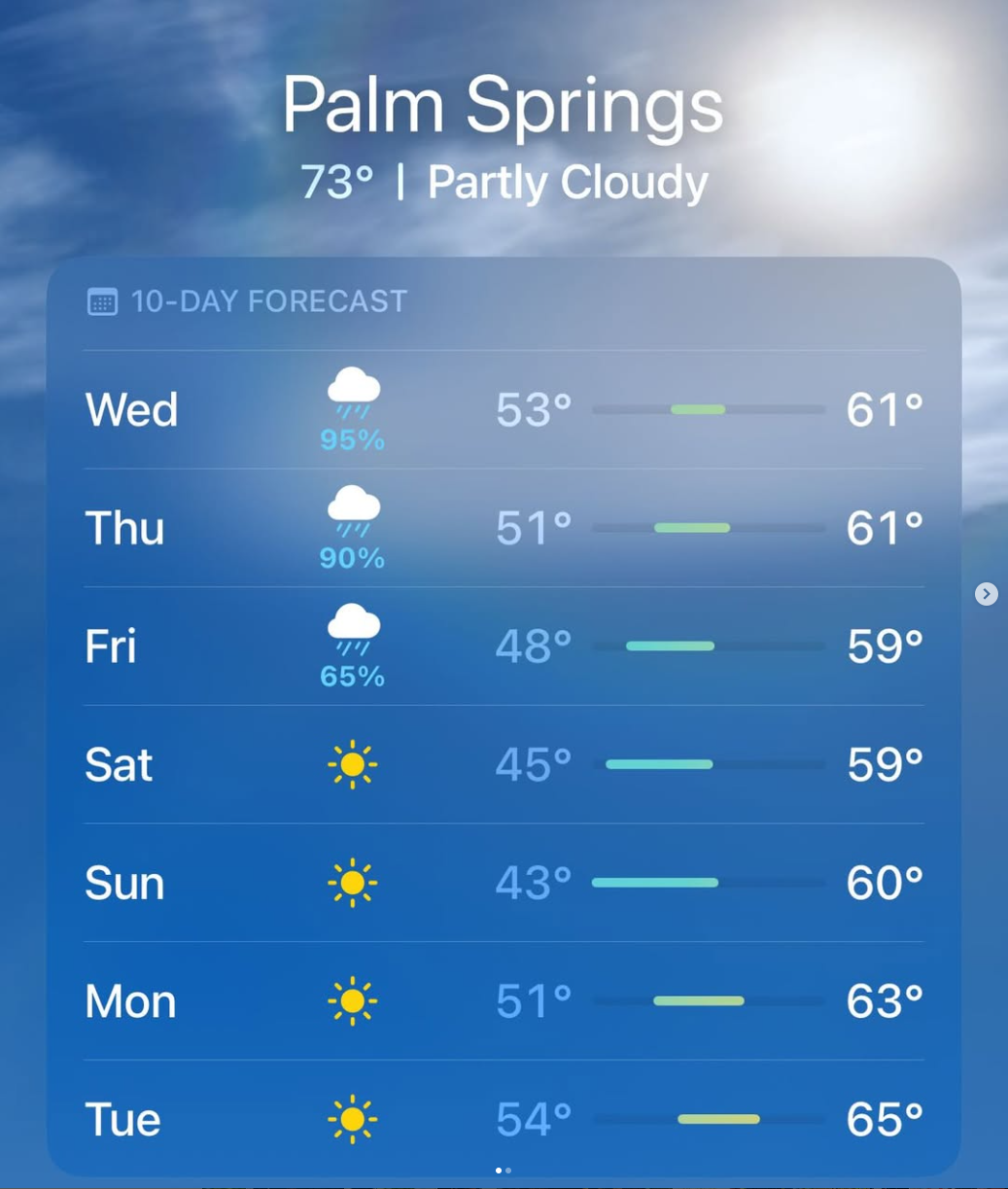 Weather Update: Palm Springs is expected to receive heavy rainfall Wednesday through Friday. Residents are encouraged to prepare in advance. Sandbags are available for pickup at any of our five fire stations, and a fresh pile of sand is available at City Hall. #rain