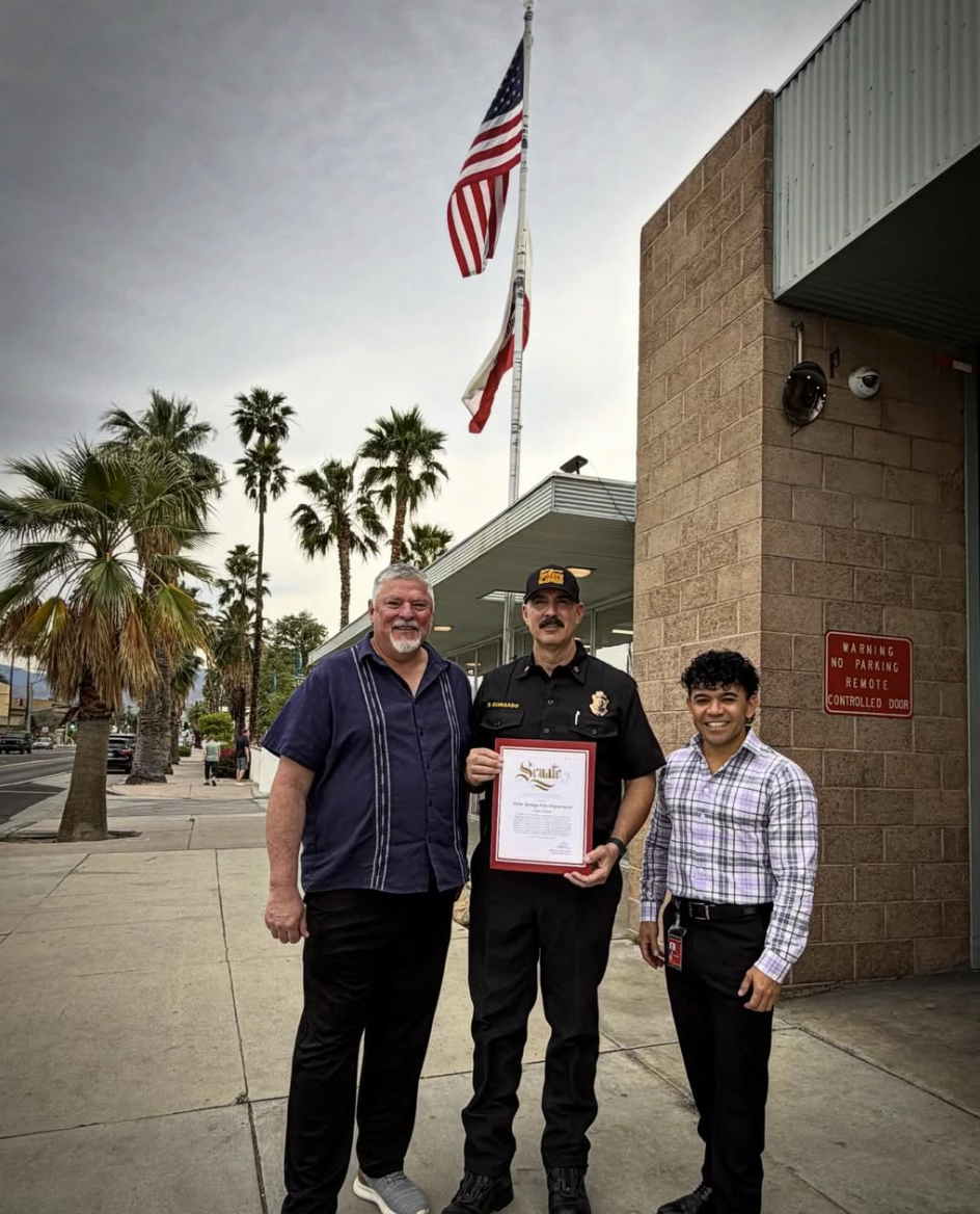 Armando Martinez. District Representative presents the Palm Springs Fire Department a letter of recognition from Senator Rosilicie Ochoa Bogh, District 19 for our Open House at FS1.