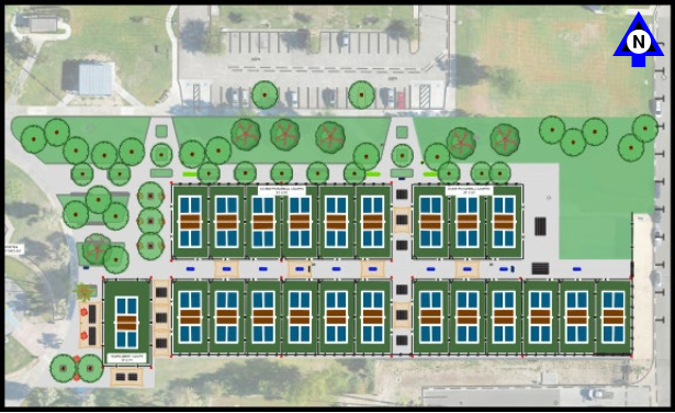 The work comprises demolishing existing Pickleball Courts, Tennis Court, picnic areas and surrounding park space. Construction includes 22 new Pickleball courts with seating areas, planters, drinking fountains, courts, lighting, drainage retention area, shade structures throughout, and new electrical service upgrade. The construction costs for this project is approximately $5.1 Million and is funded partially through Measure J.