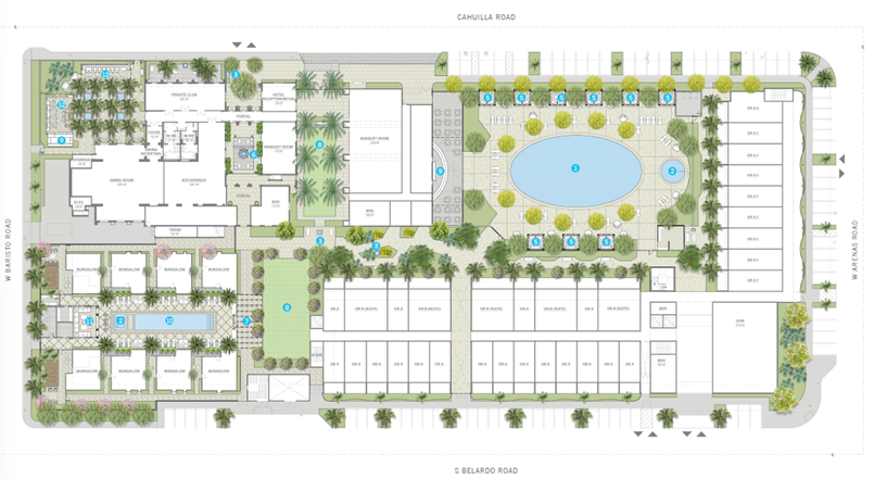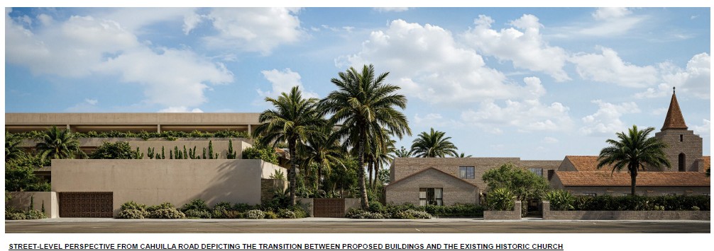 The project includes adaptive reuse of the Class 1 historic Community Church for restaurant, private club, kitchen, and back of house uses, and restoration of the eight (8) Class 1 historic bungalows of the former Orchid Tree Hotel as hotel guest rooms. The project includes demolition of existing structures at 205 South Belardo Road, 239 West Arenas Road, and 200 South Cahuilla Road. The project applications include a Development Agreement (“DA”), Development Permit (“DP”), Major Architectural application (“AR”), Certificate of Appropriateness for alterations to Class 1 historic sites, (“CAMJ”), a Minor Architectural application for demolition of existing buildings (“AR / HDEMO”), and a Conditional Use Permit (“CUP”), seeking to engage the high-rise ordinance, and approval of the restaurants, cocktail lounge, spa, and private club uses. An Operations Covenant Agreement was approved by City Council on April 23, 2025. A tentative tract map application (“TTM”) will be required for the condominium uses.