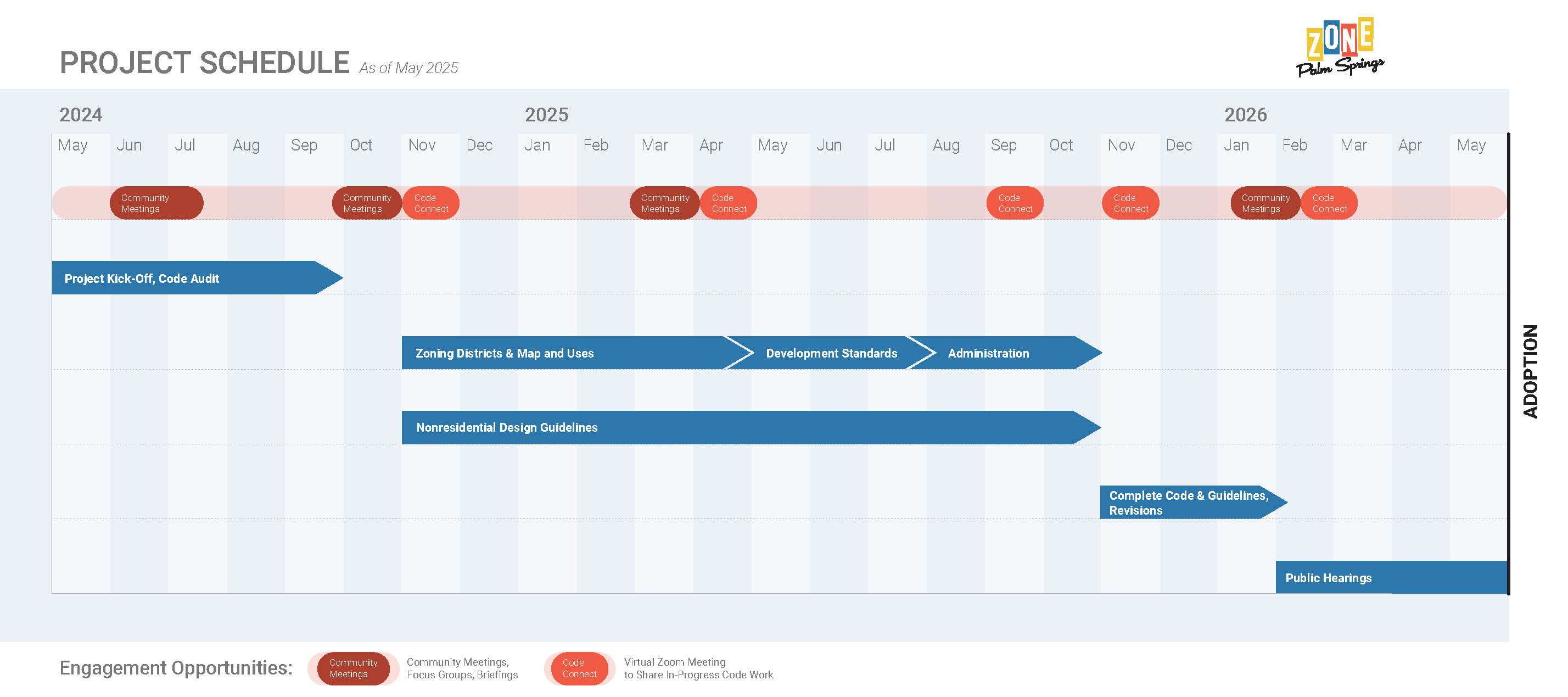 The City of Palm Springs is updating its Zoning Code to better reflect today’s needs and accommodate future growth. This is the City’s first comprehensive update to the Zoning Code since 1988 and will incorporate General Plan 2040 updated in 2025 and the 2021-2029 Housing Element updated in 2024 (click here for more on the General Plan Update).